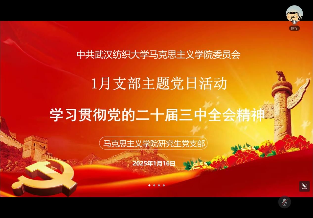 为深刻领悟党的二十届三中全会精神,进一步增强研究生党员的责任感与使命感,新葡的京集团35222vip研究生支部1月16日通过腾讯会议开展了“学习贯彻党的二十届三中全会精神”主题党课及主题党日活动。会议由陈怡同志主持,全体研究生党员参加。